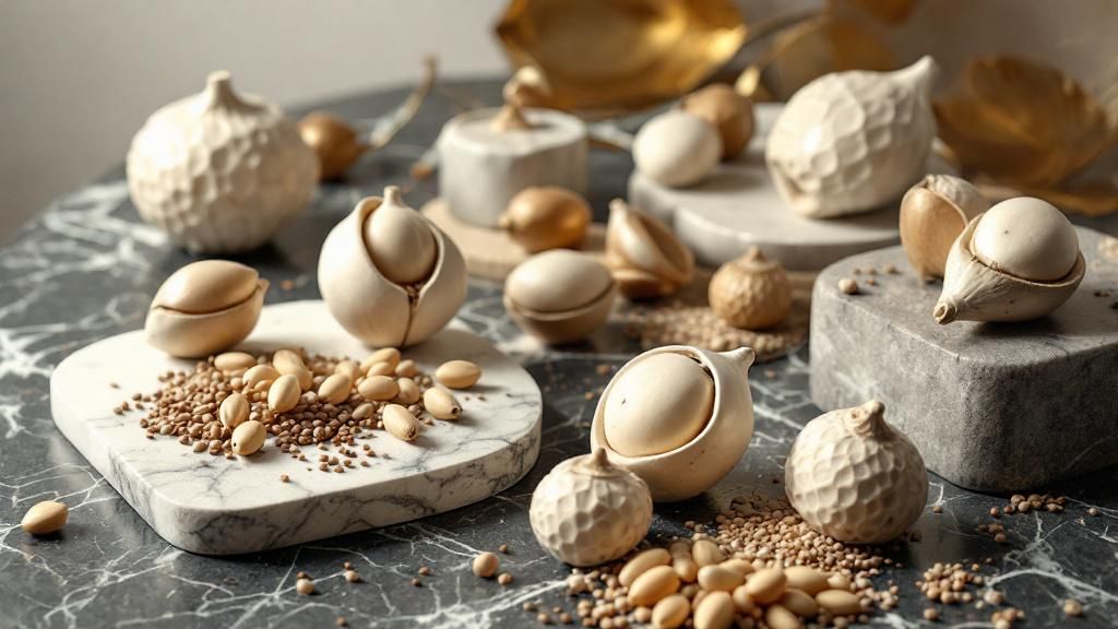 • Ceramic cocoa pods and bronze magnolia seeds tell stories with clarity and assurance